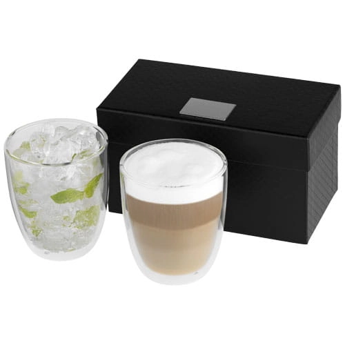 2-częściowy zestaw szkła Boda. Zestaw termoizolacyjnych szklanek o podwójnych ściankach o pojemnosci 300ml. Idealny do latte macchiatto, mrożonej herbaty lub każdego innego gorącego czy zimnego napoju. Prezentowany w luksusowym pudełku prezentowym z blaszką na logo. Szkło.