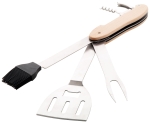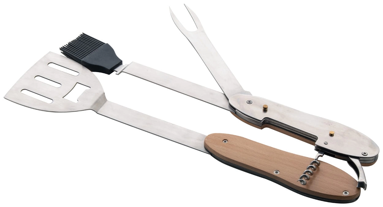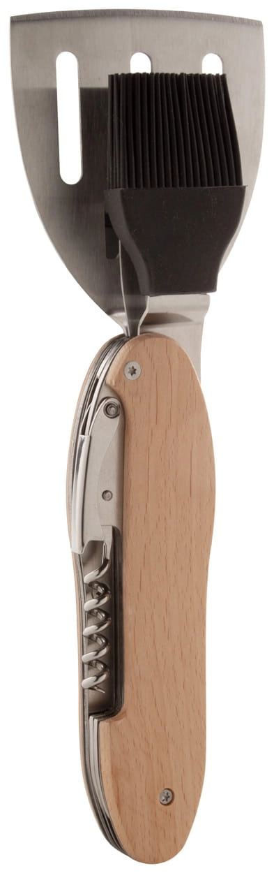 5 w 1 składany multi tool do grillowania ze stali nierdzewnej z drewnianą rączką. Z łopatką, widelcem, szczotką, otwieraczem do butelek i korkociągiem. Można podzielić go na dwa oddzielne narzędzia za pomocą przesuwanego systemu.