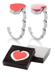 Metalowy wieszak na torbę o kształcie serca z magnetycznym zamknięciem. Produkt zapakowany w czarne pudełko.