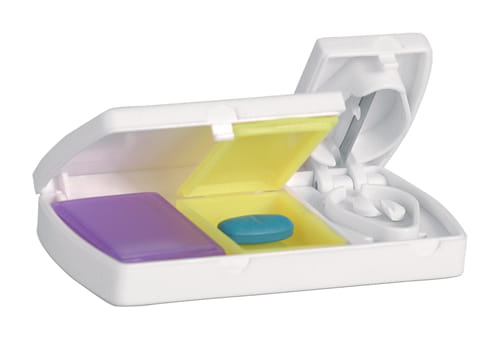 Plastikowy pojemnik na tabletki z przecinaczem do tabletek i 2 przegrodami.