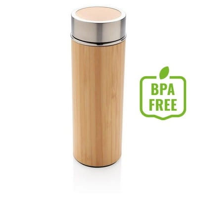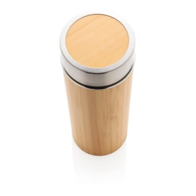 Bambusowa butelka próżniowa 350 ml, wnętrze ze stali nierdzewnej 304, powłoka z organicznego bambusa na zewnątrz, szczelna, utrzymuje napoje ciepłe do 5 godzin oraz zimne do 15 godzin
