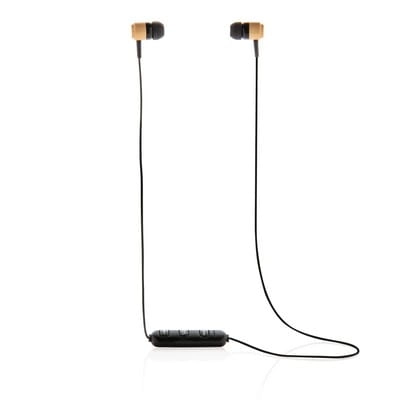 Ekologiczne słuchawki bezprzewodowe BT 5.0, douszne, magnetyczne końcówki, wykonane z bambusa, w pełni naładowane umożliwiają odtwarzanie muzyki do 3 godzin, ponowne ładowanie w 1 godzinę, zasięg do 10 m, nakładki w 3 rozmiarach i ekologiczne etui w komplecie