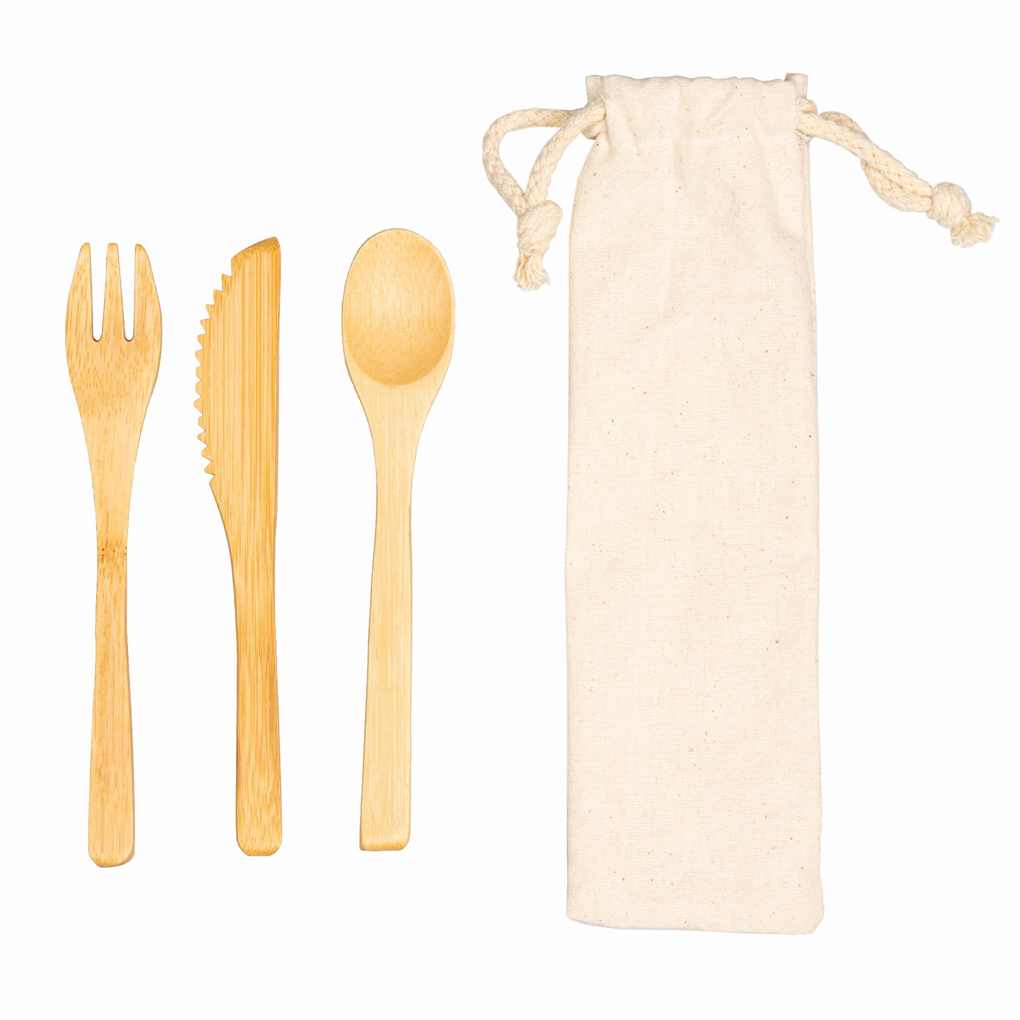 Przyjazne dla środowiska sztućce bambusowe, składające się z widelca, noża i łyżki i łyżkę w bawełnianej torbie. Idealny zestaw do przenoszenia dlatego szczególnie nadaje się na kemping lub inne zajęcia na świeżym powietrzu