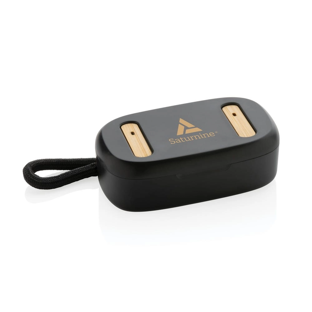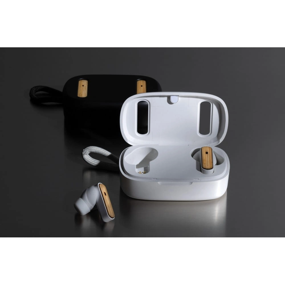 Bezprzewodowe słuchawki douszne stereo, BT 5.3, wykonane z ABS z recyklingu z certyfikatem RCS i bambusa z certyfikatem FSC® wbudowany mikrofon, funkcja odbierania połączeń, w komplecie etui z akumulatorem 400 mAh pełni funkcję stacji ładującej, akumulator słuchawek o pojemności 40 mAh umożliwia odtwarzanie muzyki na średnim poziomie głośności do 5 godzin, ponowne naładowanie za pomocą etui w 1 godzinę, zasięg do 10 m, 3 rozmiary nakładek dousznych w komplecie, nie zawiera PVC