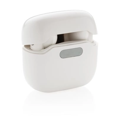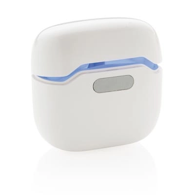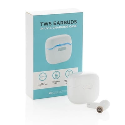 Bezprzewodowe słuchawki duszne, BT 5.0, wykonane z ABS, etui posiada funkcję sterylizacji, wbudowane diody UV-C zabijają do 99,9% bakterii, dzięki specjalnej konstrukcji po otwarciu urządzenia w trakcie sterylizacji światło wyłączy się automatycznie bez narażania użytkownika, długość fali UV-C 270nm-280nm, wbudowany mikrofon, funkcja odbierania połączeń stereo, przycisk dotykowy, etui z akumulatorem 300 mAh pełniące funkcję stacji ładującej w komplecie, akumulator słuchawek o pojemności 30 mAh umożliwia odtwarzanie muzyki na średnim poziomie głośności do 4 godzin, ponowne naładowanie za pomocą etui w 1,5 godziny, zasięg do 10 m, 3 rozmiary nakładek dousznych w komplecie, kabel micro USB z TPE bez dodatku PVC w komplecie