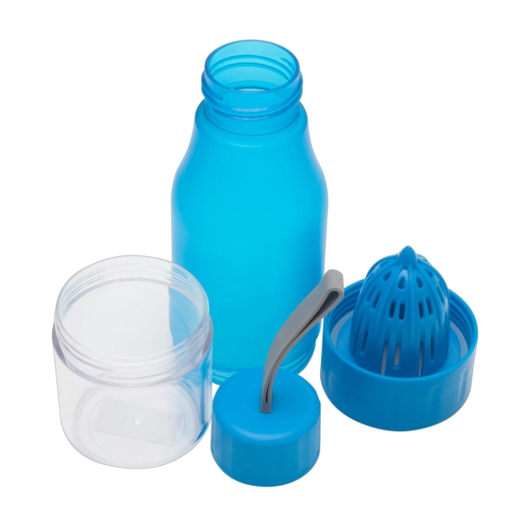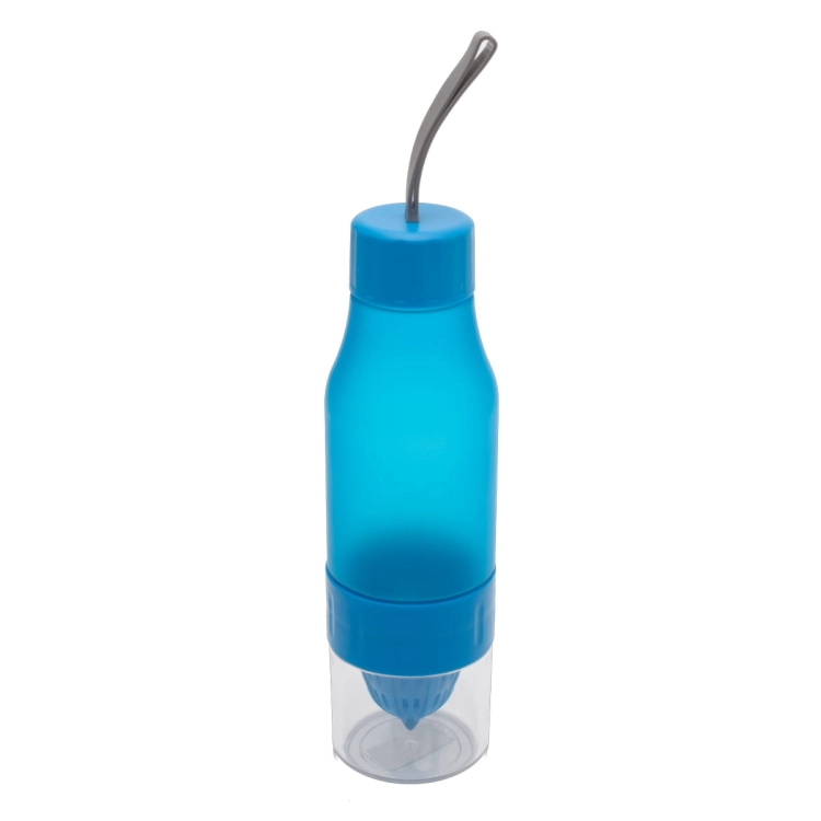 Wykonany z ABS, polipropylenu i poliwęglanu bidon 600 ml z wyciskarką do soków. Wyposażony w zakrętkę z gwintem. Przyjemna w dotyku, gumowana powierzchnia.