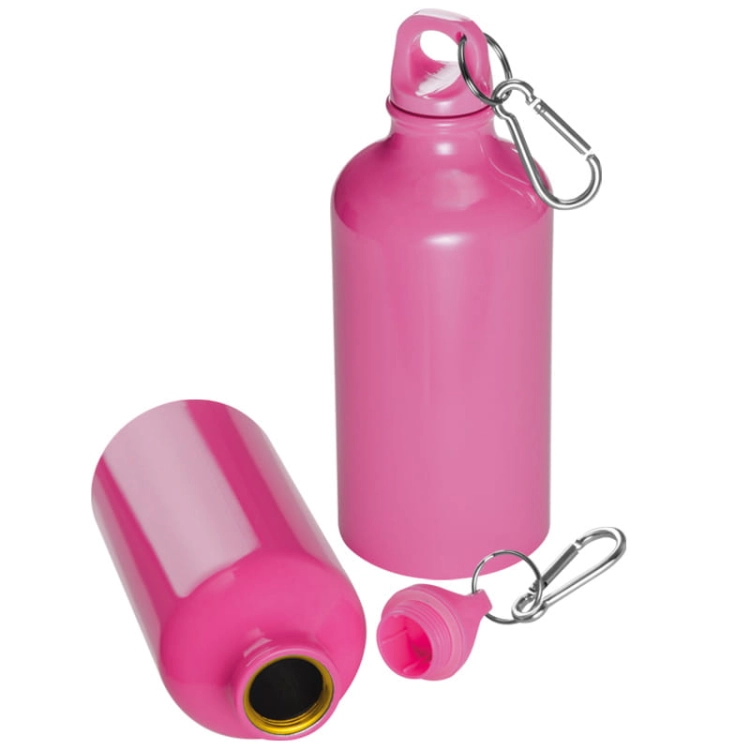 Materiał: aluminium, PP, silikon informacja: 500ml, metalowy karabińczyk rodzaj nadruku: grawer laserowy powierzchnia graweru: z jednej strony opakowanie jednostkowe: torebka foliowa grupa nadruku: L3