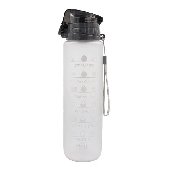 Bidon z tritanu, motywujący do nawadniania się podczas treningów i na co dzień. Podziałka zawiera hasła zachęcające do regularnego picia wody. Nakrętka posiada blokadę i uchwyt.