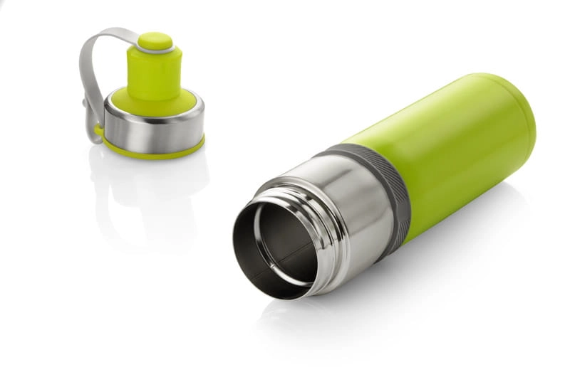 Sportowy bidon z próżnią przyda się na letnie wycieczki rowerowe bądź treningi na świeżym powietrzu. Dzięki zastosowanej do izolacji bidonu próżni utrzymuje on temperaturę napoju zarówno ciepłego jak i zimnego. Wygodne zamknięcie umocowane na pasku jest praktycznym rozwiązaniem podczas uprawiania sportu. Bidon wykonany ze stali nierdzewnej o podwyższonym standardzie.