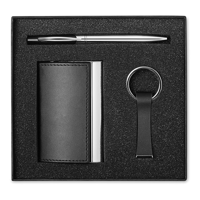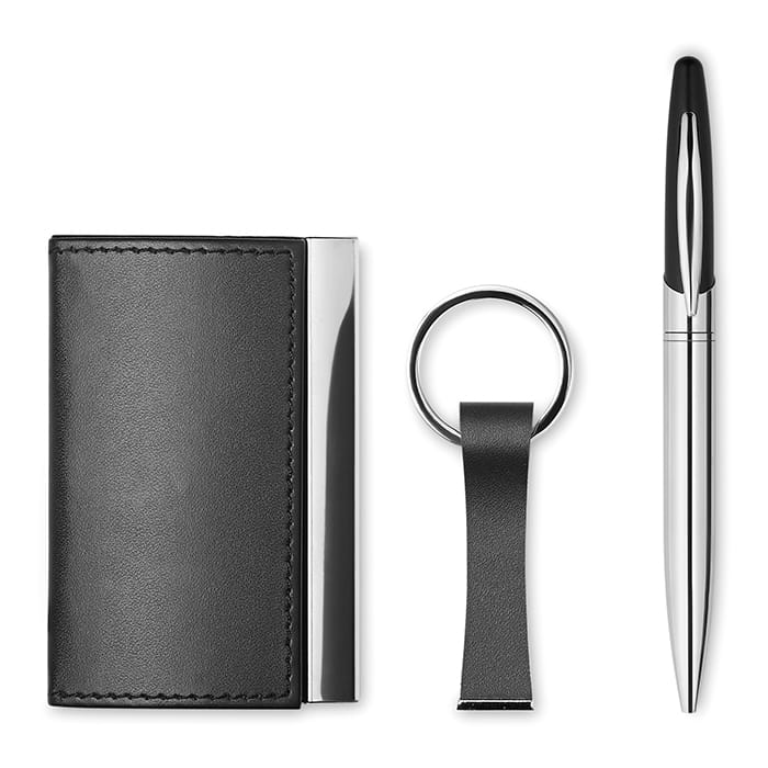 Biznesowy zestaw upominkowy zawierający przekręcany długopis ze stopu cynku, brelok z PU oraz wizytownik. Całość w pudełku. Czarny wkład w długopisie.