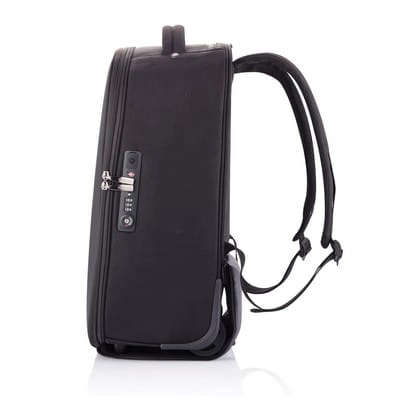 Bobby, plecak na kółkach chroniący przed kieszonkowcami, wykonany z materiałów pochodzących z recyklingu, teleskopowy uchwyt, chowane paski na ramiona, osłona na koła zapobiegająca ubrudzeniu, zintegrowany port USB do ładowania telefonów (power-bank nie jest dołączony), przestronna przegroda główna zamykana na zamek cyfrowy TSA®, wiele kieszeni wewnątrz, przegroda na laptopa do 17", kieszeń z ochroną RFID, rozmiar bagażu podręcznego, wzór zastrzeżony®