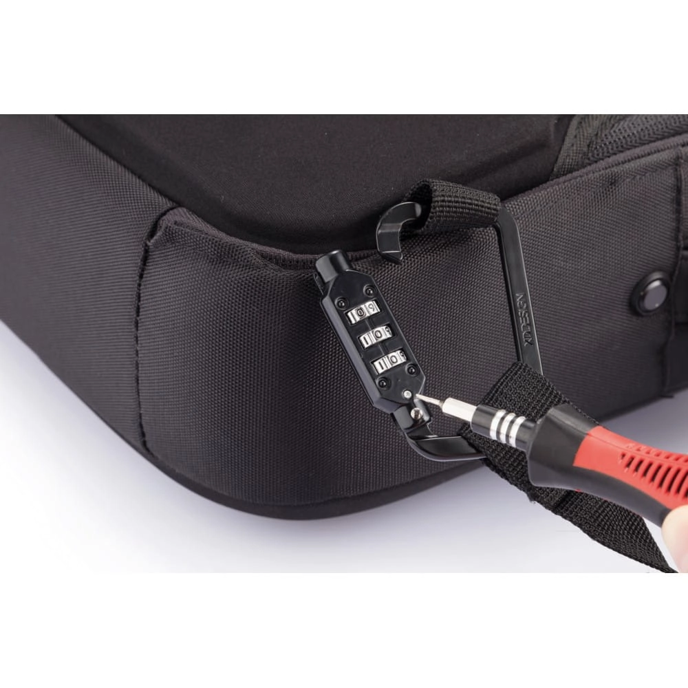 Torba, plecak chroniący przed kieszonkowcami Bobby Bizz, wykonany z wysokiej jakości poliestru, odblaskowe nadruki zwiększające bezpieczeństwo w nocy, wewnątrz usztywnione przegrody na laptopa 15,6", tablet do 10", specjalna metalowa konstrukcja chroniąca przedmioty i zachowująca kształt plecaka, możliwość używania plecaka również jako torby, zintegrowana kłódka umożliwiająca przypięcie plecaka do stałego obiektu, pasek do zamocowania na walizce w komplecie, wzór zastrzeżony®