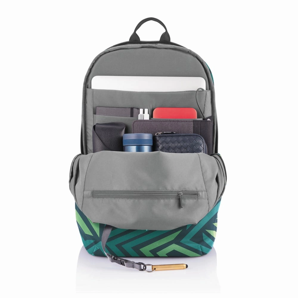 Plecak chroniący przed kieszonkowcami Bobby Soft, wodoodporny materiał, wykonany z przyjaznego środowisku materiału rPET, ukryte zamki i kieszenie, kieszenie z ochroną RFID, przestronna przegroda główna z kieszeniami wewnątrz i miękką przegrodą na laptopa do 15,6", zintegrowany port USB do ładowania telefonów (power-bank nie jest dołączony), rozszerzalna górna część plecaka