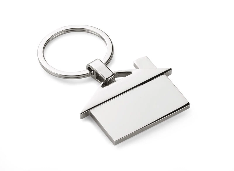 Brelok metalowy w kształcie domku. Logo grawerujemy na powierzchni breloka.