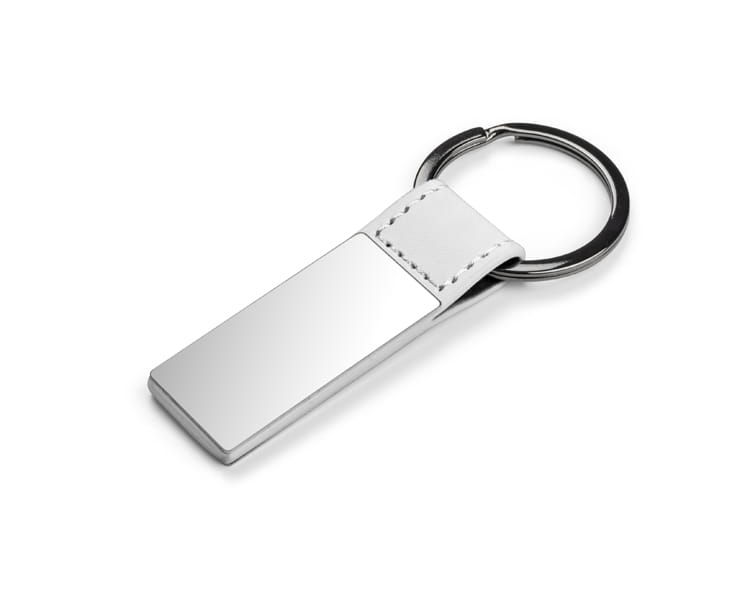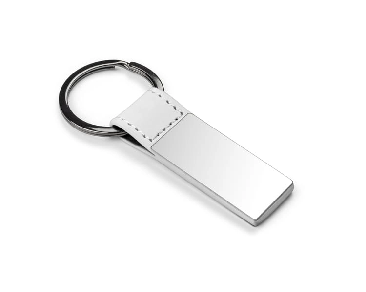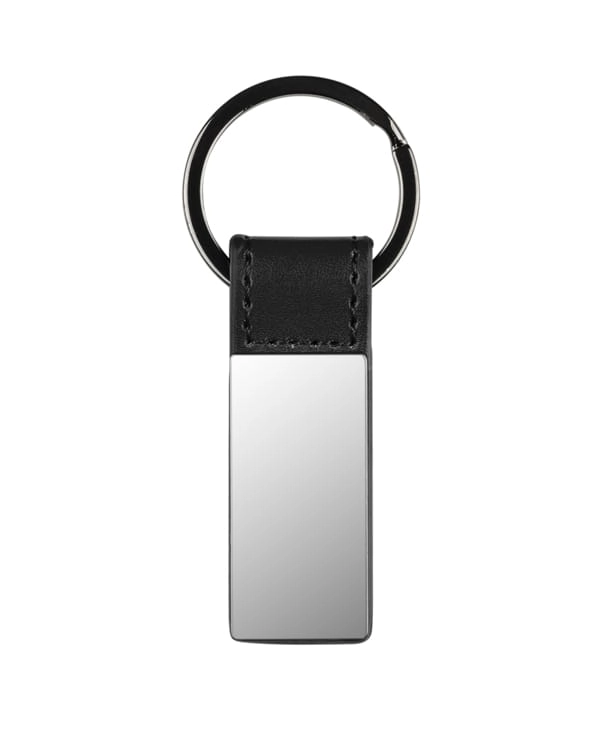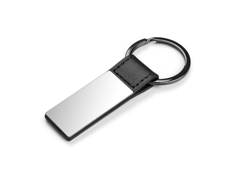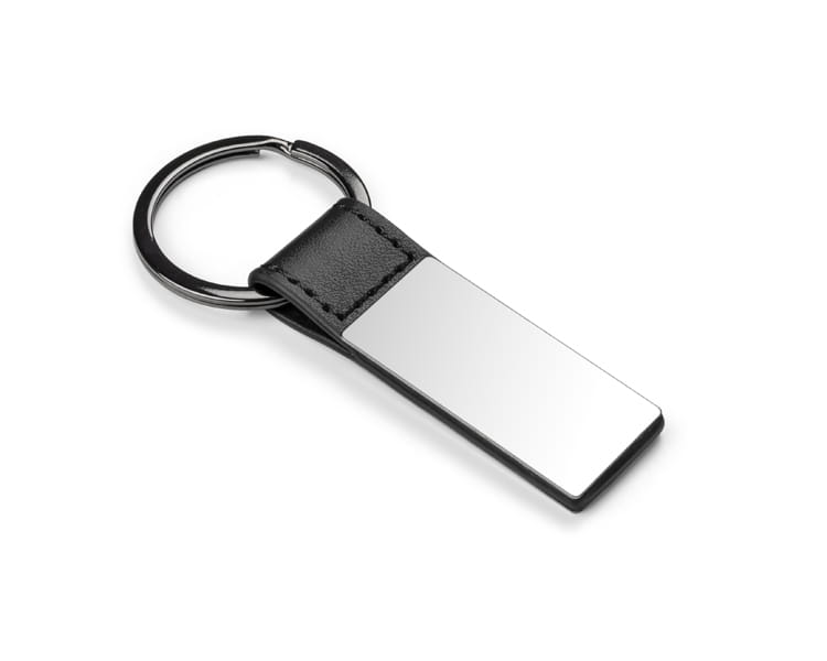 Elegancki dwustronny brelok wykonany z ekoskórki PU i metalu w kolorze grafitowym. Logo wygrawerujemy na metalowej blaszce.