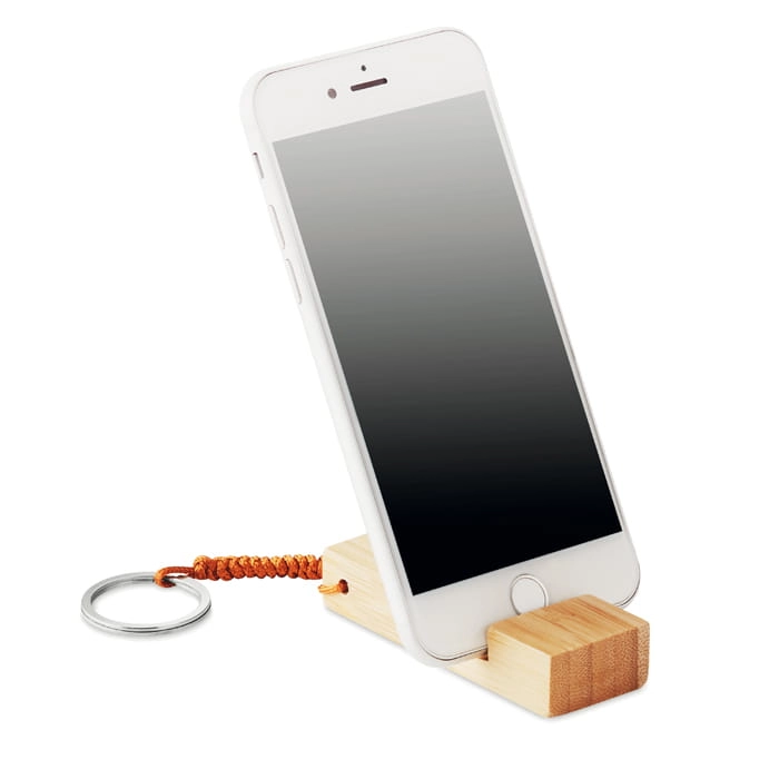Breloczek z podstawką na smartfona, wykonany z bambusa. Bambus jest materiałem naturalnym, jego kolor może się różnić w poszczególnych przypadkach.