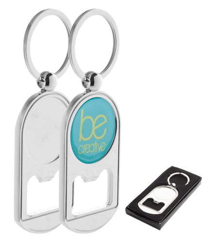 Metalowy otwieracz do butelek z brelokiem i nadrukiem epoxy doming. W czarnym pudełku. Cena zawiera znakowanie. Min. zam.: 100 szt.