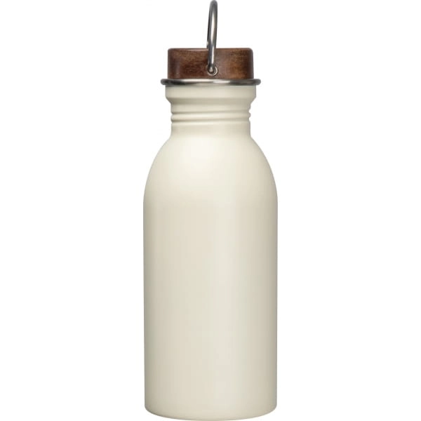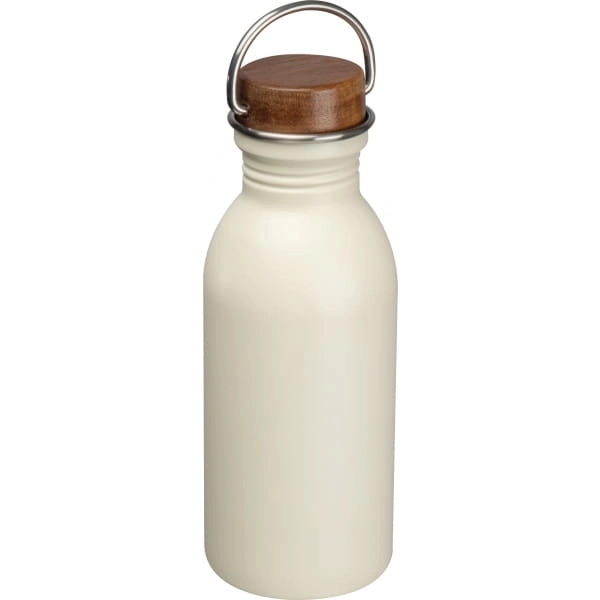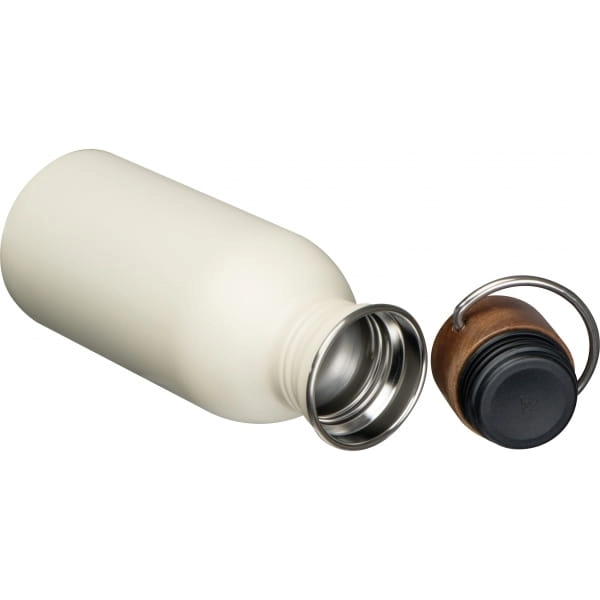 Butelka do picia, wykonana ze stali nierdzewnej z recyklingu, zamykana na zakrętkę z drewna akacjowego, wyposażona w uchwyt do przenoszenia. Pojemność 500 ml.