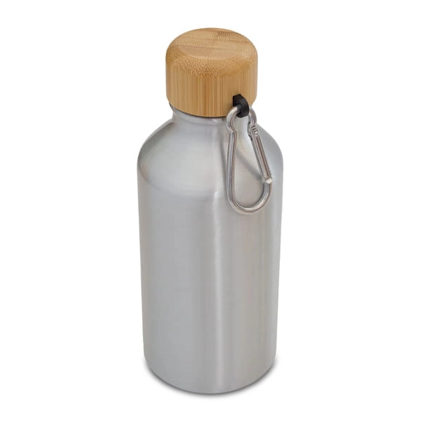 Bidon aluminiowy o pojemności 400 ml, z karabińczykiem. Posiada szczelne zamknięcie typu leak proof zapobiegające wyciekaniu płynów. Efektowna nakrętka wykonana z bambusa.