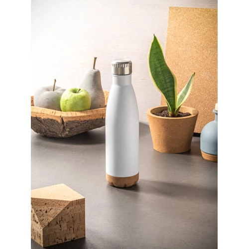 Dwuścienna, izolowana próżniowo butelka ze stali nierdzewnej z korkową podstawą. Utrzymuje temperaturę napojów przez 8 godzin, a zimno przez 24 godziny. Pojemność do 560 mL. Dostarczany w pudełku upominkowym z papieru kraft