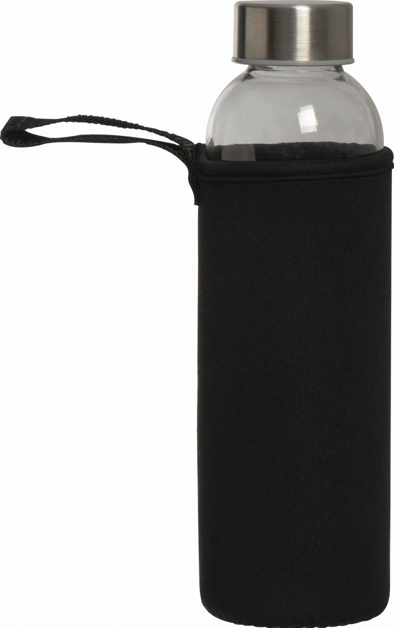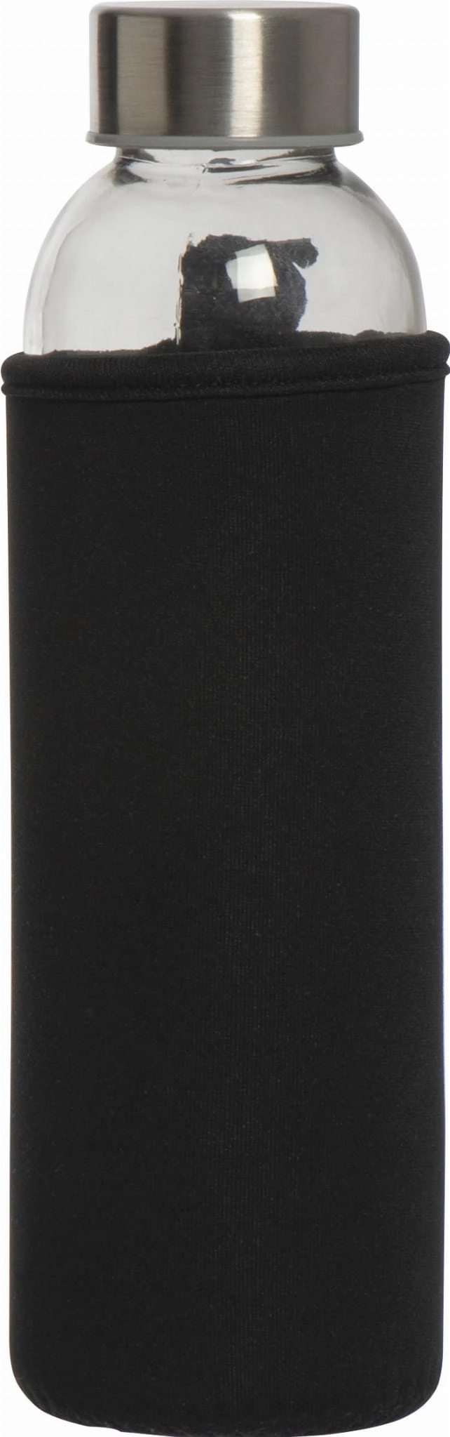 Szklana butelka z metalową zakrętką, w etui z neoprenu, 500 ml. Pakowana w kartonik.