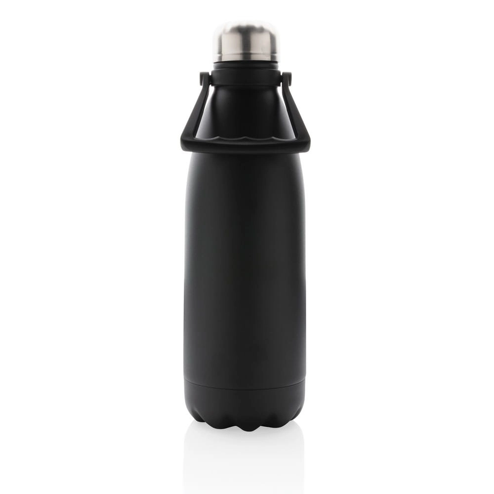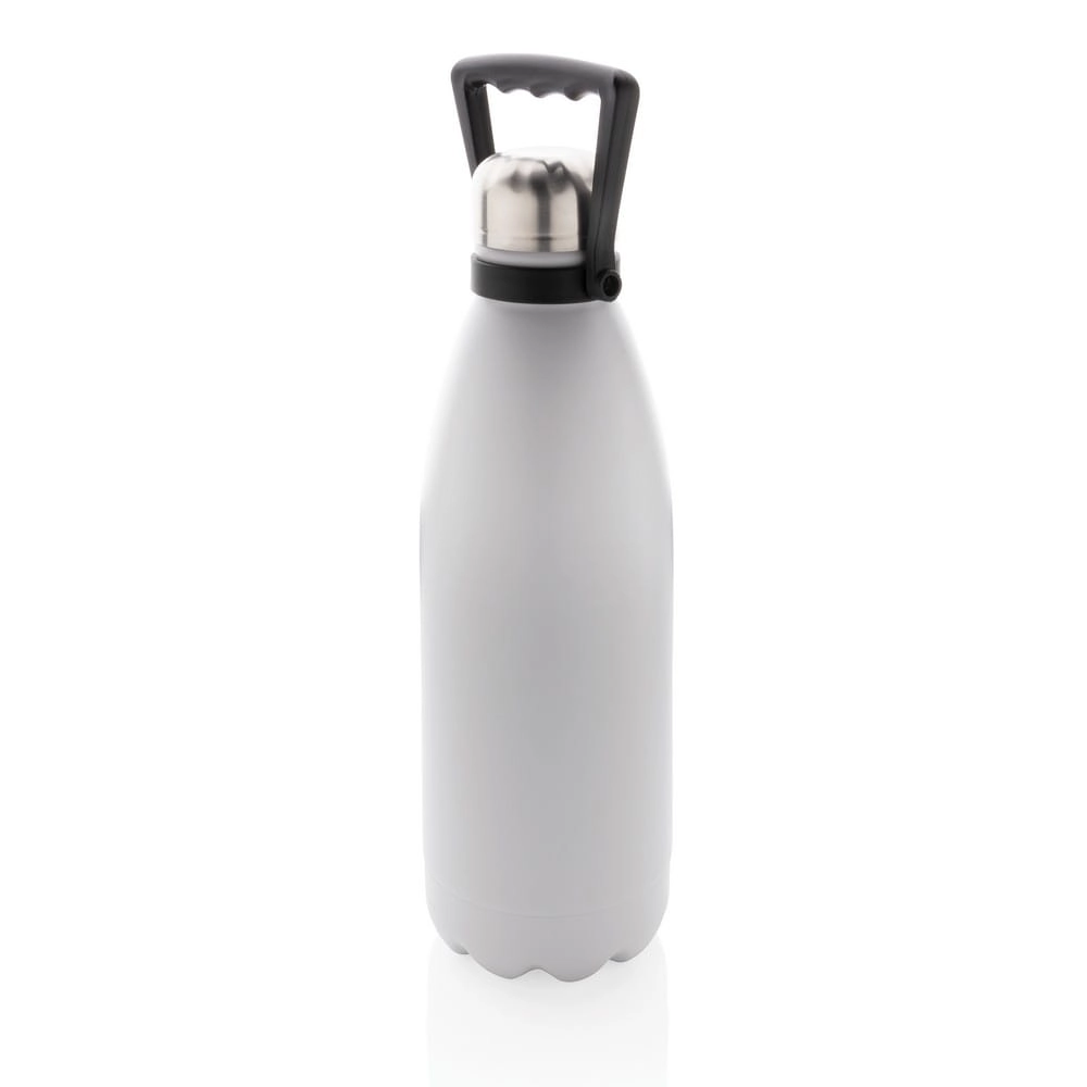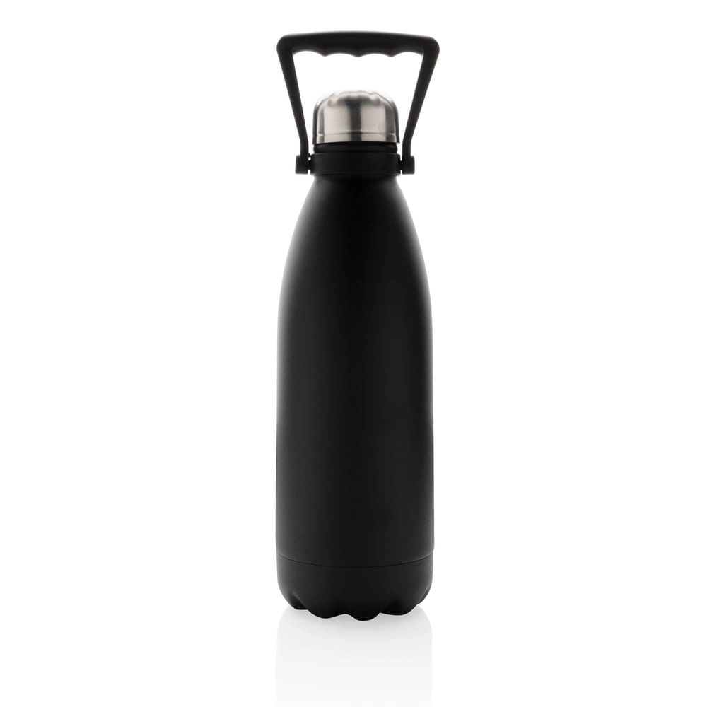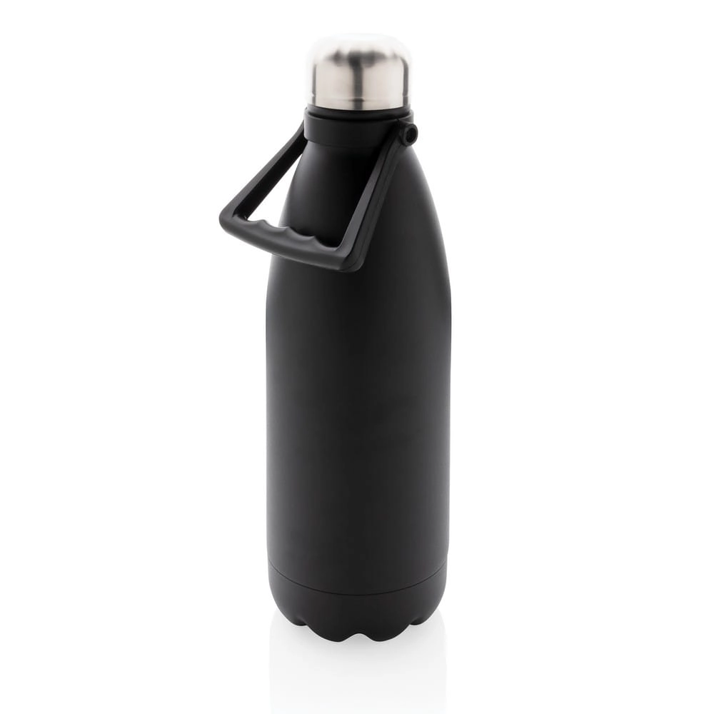 Butelka termiczna 1500 ml z uchwytem, proszkowa powłoka, wykonana ze stali nierdzewnej pochodzącej z recyklingu, całkowita zawartość materiałów z recyklingu obliczona na podstawie wagi całkowitej przedmiotu: 88%, podwójne ścianki z próżnią pomiędzy, utrzymuje temperaturę napojów ciepłych do 5 godzin oraz zimnych do 15 godzin, w opakowaniu z certyfikatem FSC®