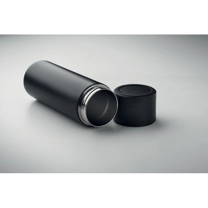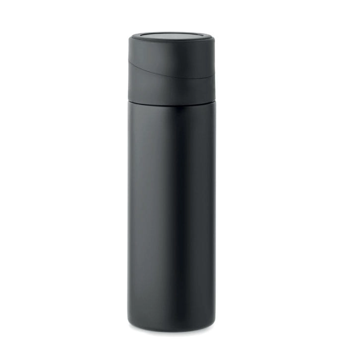 Dwuścienna butelka z izolacją próżniową z recyklingowanej stali nierdzewnej (90% z recyklingowanej stali nierdzewnej i 10% ze stali nierdzewnej) z silikonową, antypoślizgową zakrętką z uchwytem na telefon. Pojemność: 420 ml.