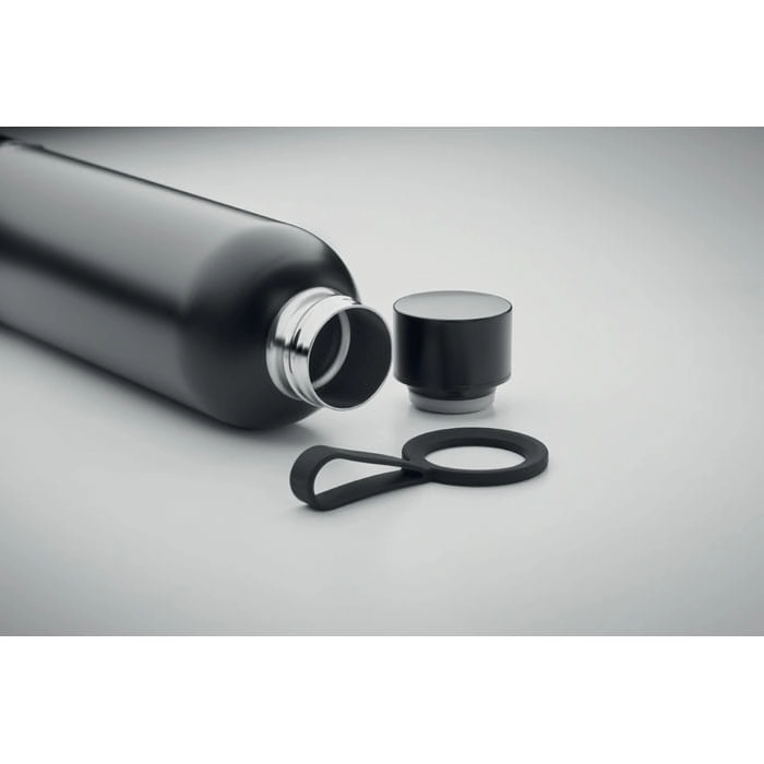 Dwuścienna butelka z izolacją próżniową ze stali nierdzewnej z recyklingu (90% stali nierdzewnej z recyklingu i 10% stali nierdzewnej) i silikonowym uchwytem, z głośnikiem bezprzewodowym 3W. Pojemność: 500 ml. Wbudowana bateria: 500 mAh. Głośnik jest odłączany.