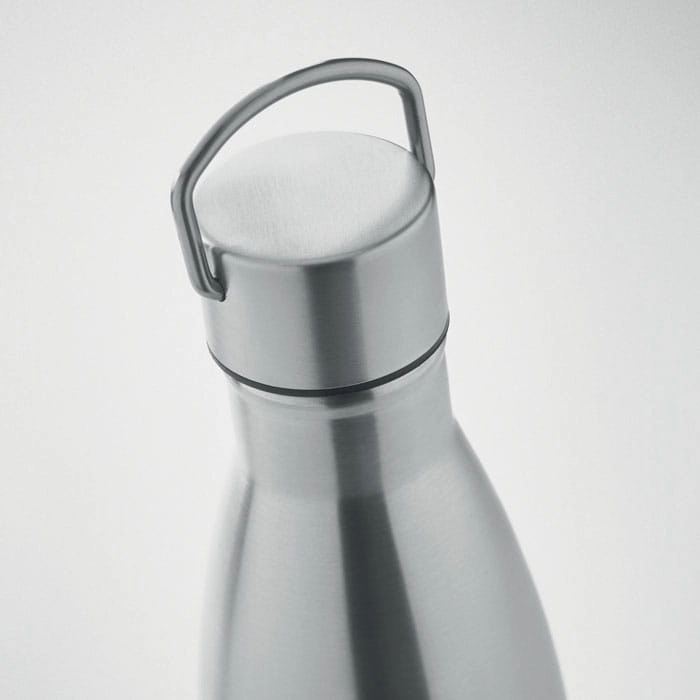 Butelka izolowana próżniowo z podwójną ścianką ze stali nierdzewnej z recyklingu (90% recyklingowanej stali nierdzewnej i 10% stali nierdzewnej), zakrętka z uchwytem. Szczelna. Pojemność: 500 ml.