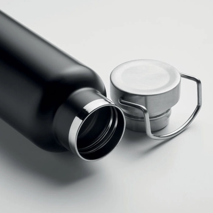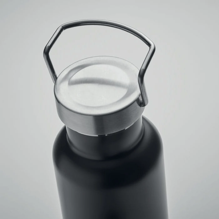 Dwuścienna, izolowana próżniowo butelka z recyklingowanej stali nierdzewnej z pokrywką z uchwytem i korkową podstawą. Nie przecieka. Pojemność: 500 ml. (90% stali nierdzewnej z recyklingu i 10% stali nierdzewnej).