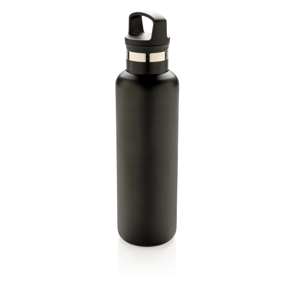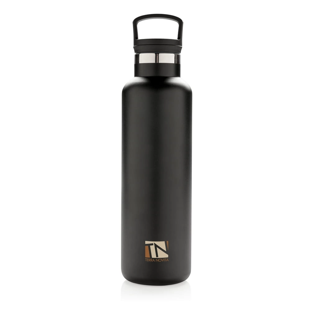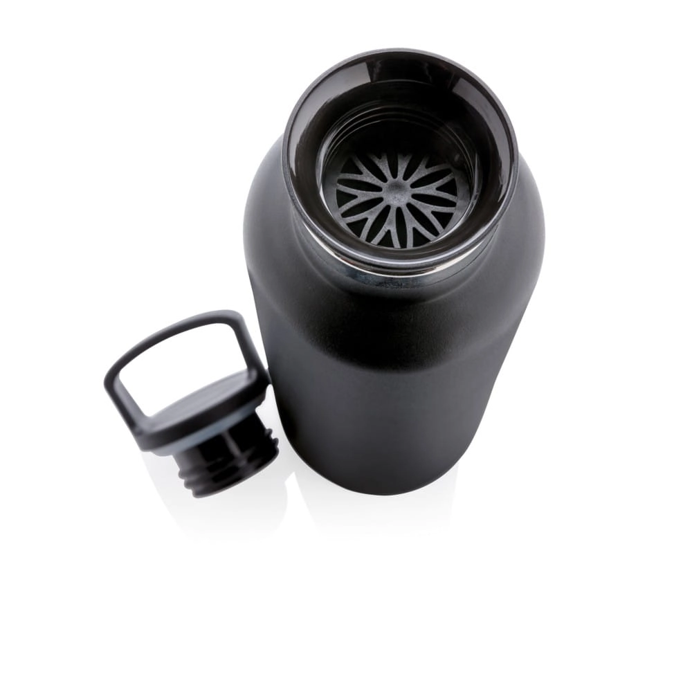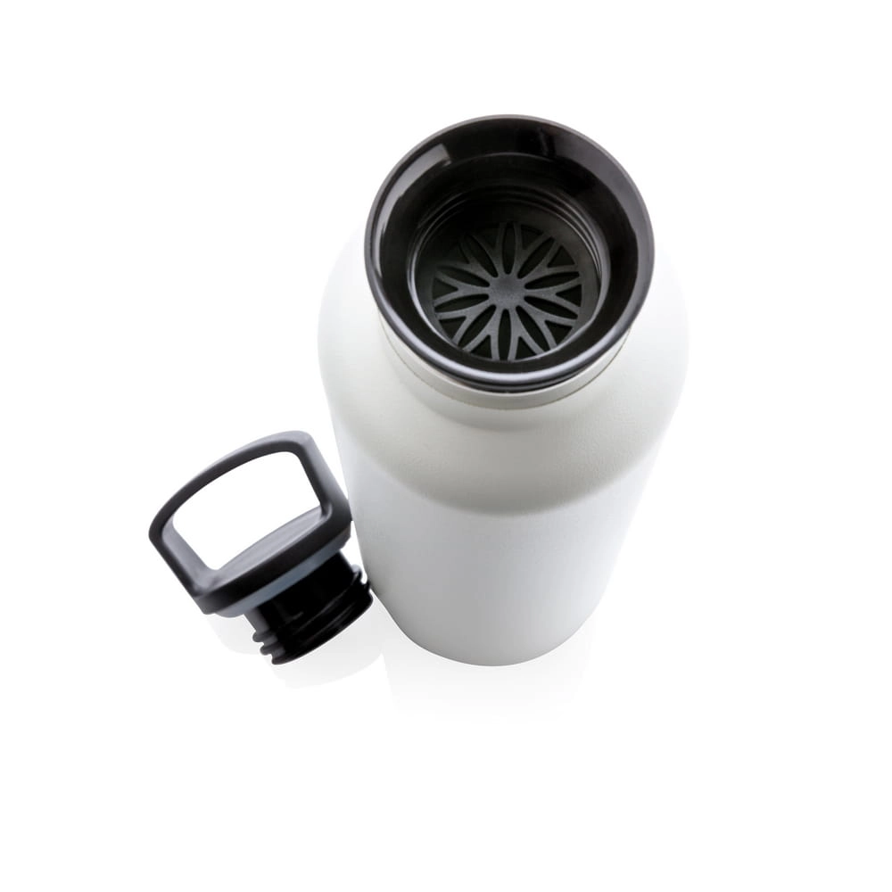 Butelka termiczna 600 ml, proszkowa powłoka, podwójne ścianki, zakrętka 2 w 1 z wyjmowanym sitkiem do zaparzania herbaty lub dodawania do wody owoców i ziół, ustnik do sączenia napojów i dodawania kostek lodu, wewnątrz stal nierdzewna 304, stal nierdzewna 201 na zewnątrz, utrzymuje temperaturę ciepłych napojów do 5 godzin oraz zimnych do 15 godzin