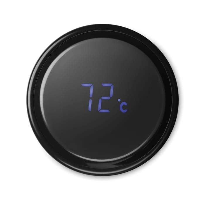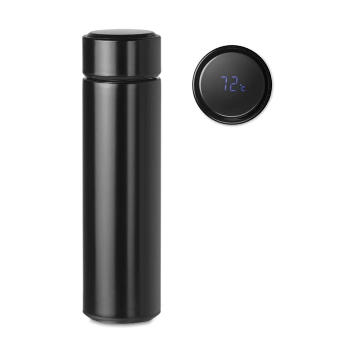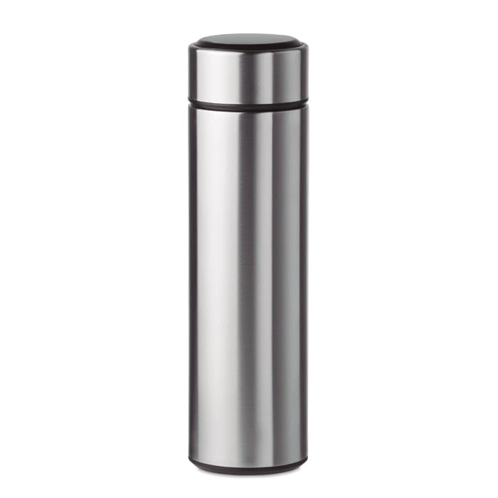 Butelka ze stali nierdzewnej, posiada podwójne ścianki z izolacyjną komorą próżniową. Wbudowany dotykowy termometr LED na pokrywie i zaparzacz do herbaty.1 bateria CR 2450. Szczelna. Poj. 450 ml.