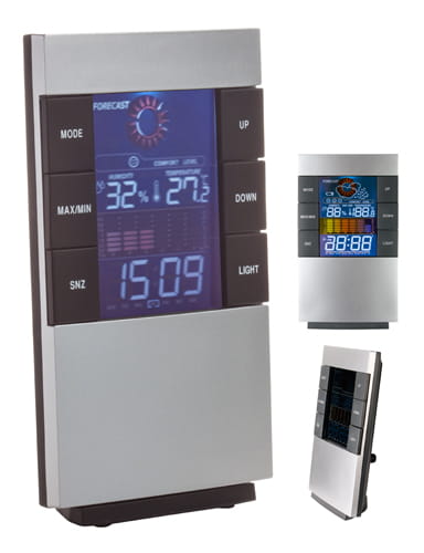 Cyfrowy zegar i stacja pogodowa z kolorowym wyświetlaczem. Funkcje: alarm, pomiar wilgoci i temperatury.