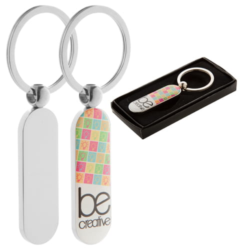 Metalowy brelok w czarnym opakowaniu prezentowym.