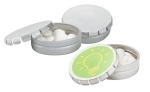 Okrągłe, metalowe pudełko z cukierkami miętowymi (12 gram) Otwiera się poprzez naciśnięcie wieczka.