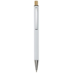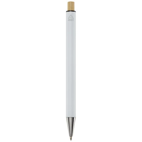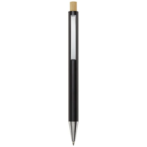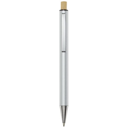 Cyrus długopis wykonany z aluminium pochodzącego z recyklingu, którego produkcja wymaga mniej energii niż w przypadku aluminium wyprodukowanego z surowców. Ogranicza również ilość odpadów na wysypiskach śmieci i pomaga chronić zasoby naturalne w celu zmniejszenia emisji gazów cieplarnianych. Przycisk jest wykonany z bambusa. Kolor tuszu: Niebieski. Żywotność: 800 metrów. Rozmiar stalówki: 1,00 mm.