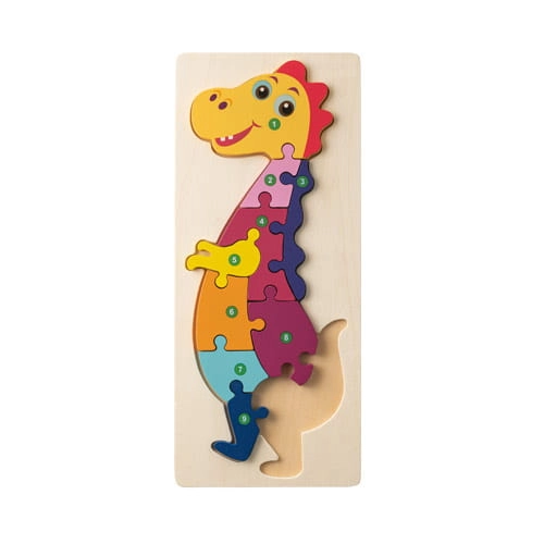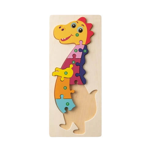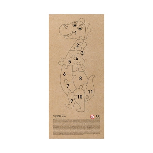 Puzzle w kształcie dinozaura ze sklejki sosnowej. Każda część jest ponumerowana, aby ułatwić montaż. Podstawa, również ze sklejki, ma możliwość personalizacji. Dostarczany w pudełku upominkowym z papieru kraft