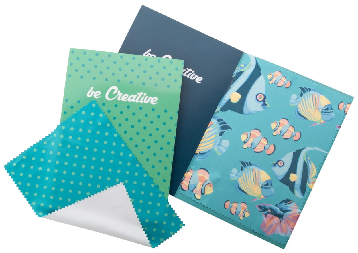 Własnego projektu papierowa kartka z grafiką po obu stronach i sublimacyjnie nadrukowaną ściereczką do okularów z mikrofibry (180 g/m²). Min. ilość: 100szt.