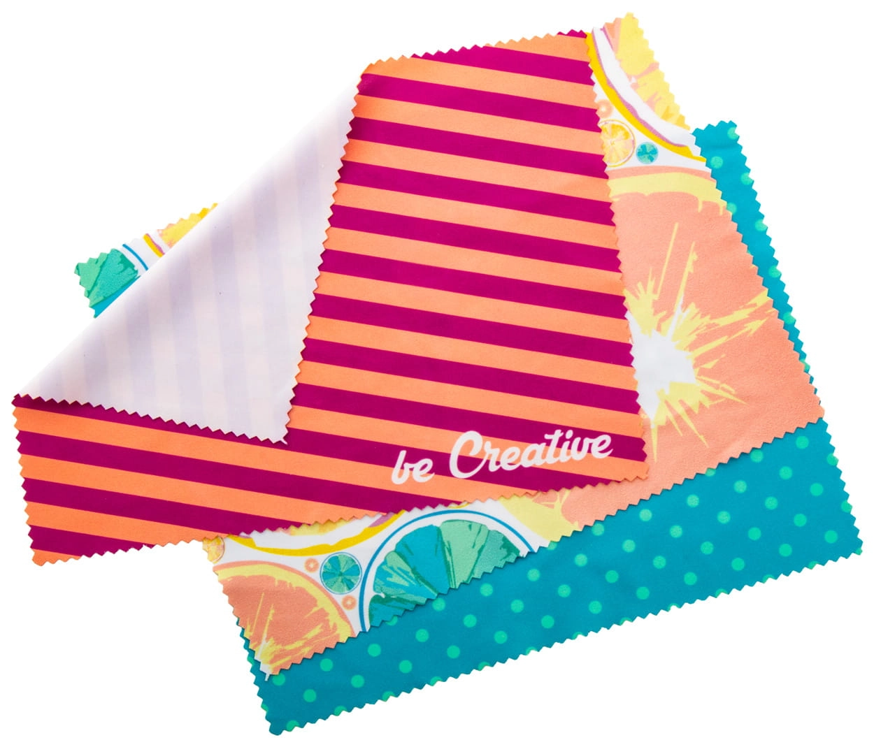 Dużego rozmiaru ściereczka do okularów (180 g/m²). Zawiera nadruk sublimacyjny. Min. ilość: 100szt.