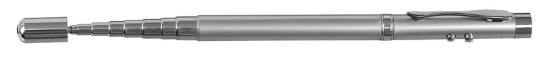 Praktyczny prezent w postaci metalowego długopisu z klasycznym wskaźnikiem teleskopowym, wskaźnikiem laserowym i latarką LED. Dołączone baterie. Zestaw pakowany w srebrne opakowanie upominkowe.