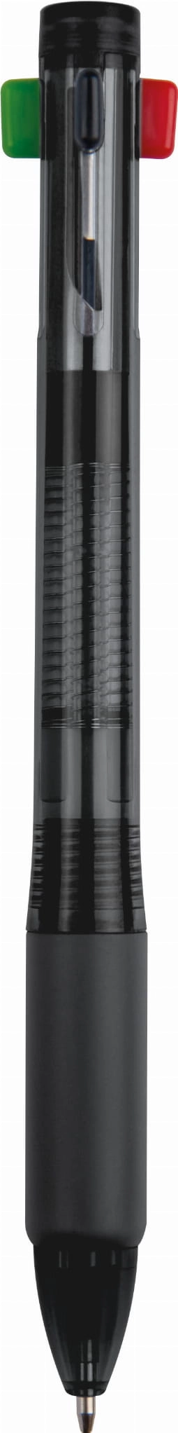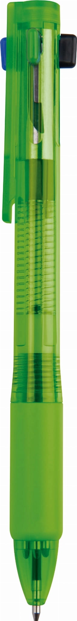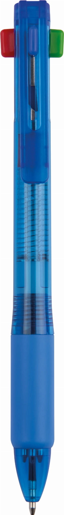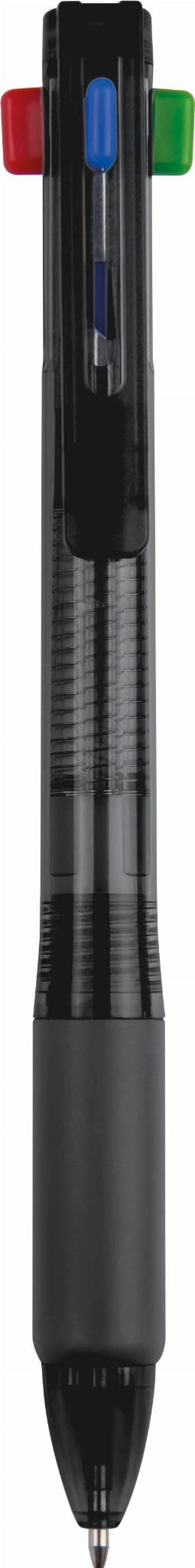 Plastikowy długopis, zawiera 4 wkłady o różnych kolorach, posiada gumowany uchwyt. Pakowany w folijkę.