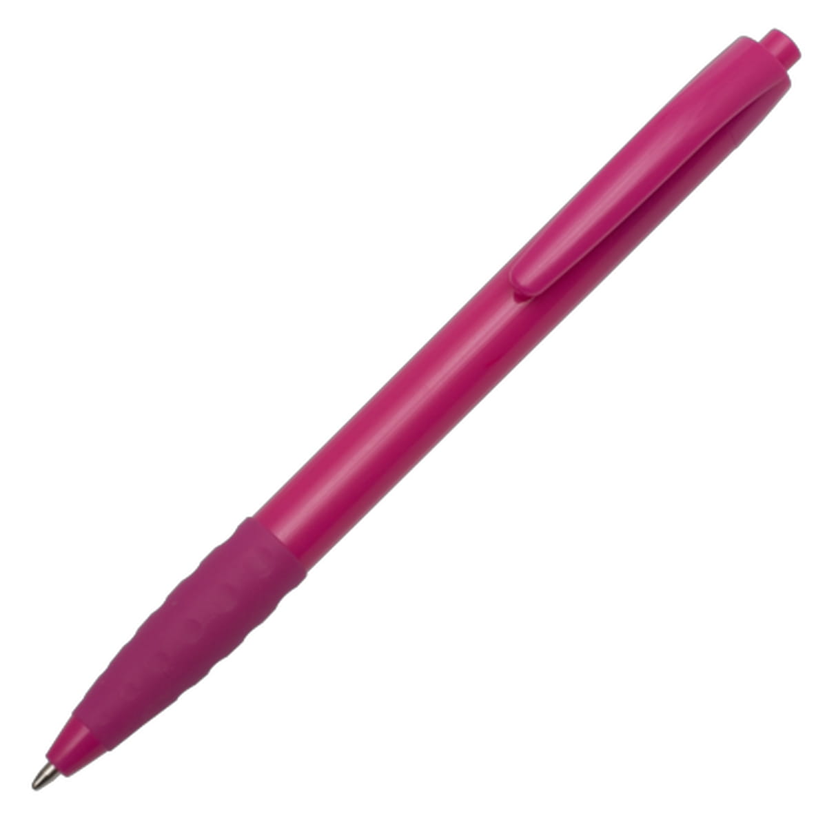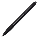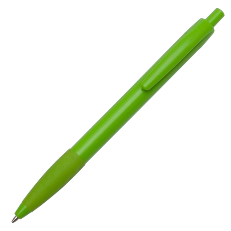 Plastikowy długopis promocyjny z gumowym uchwytem. Wyposażony w niebieski wkład.