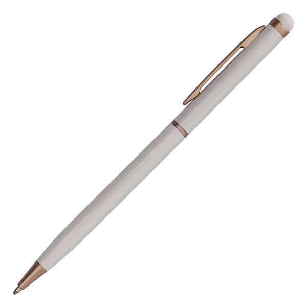 Wykonany z aluminium długopis z końcówką przystosowaną do ekranów dotykowych. Wyposażony w niebieski wkład.