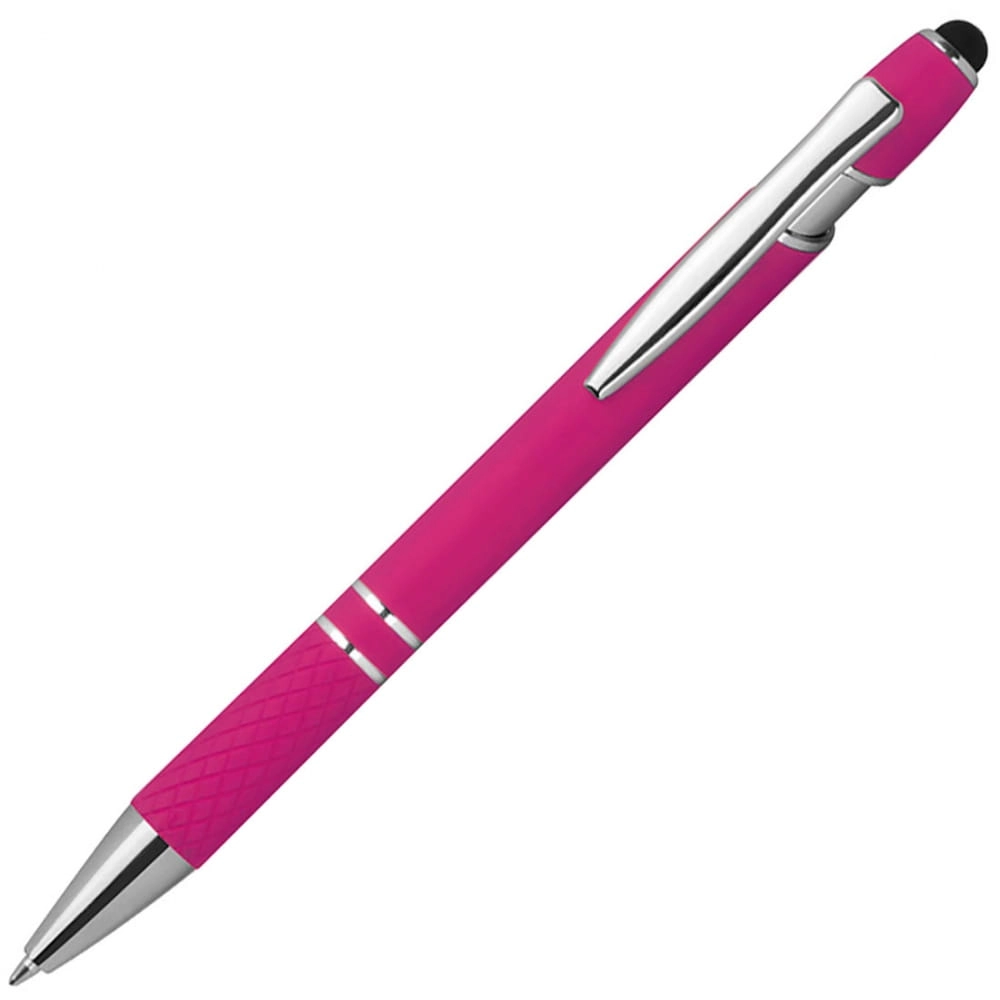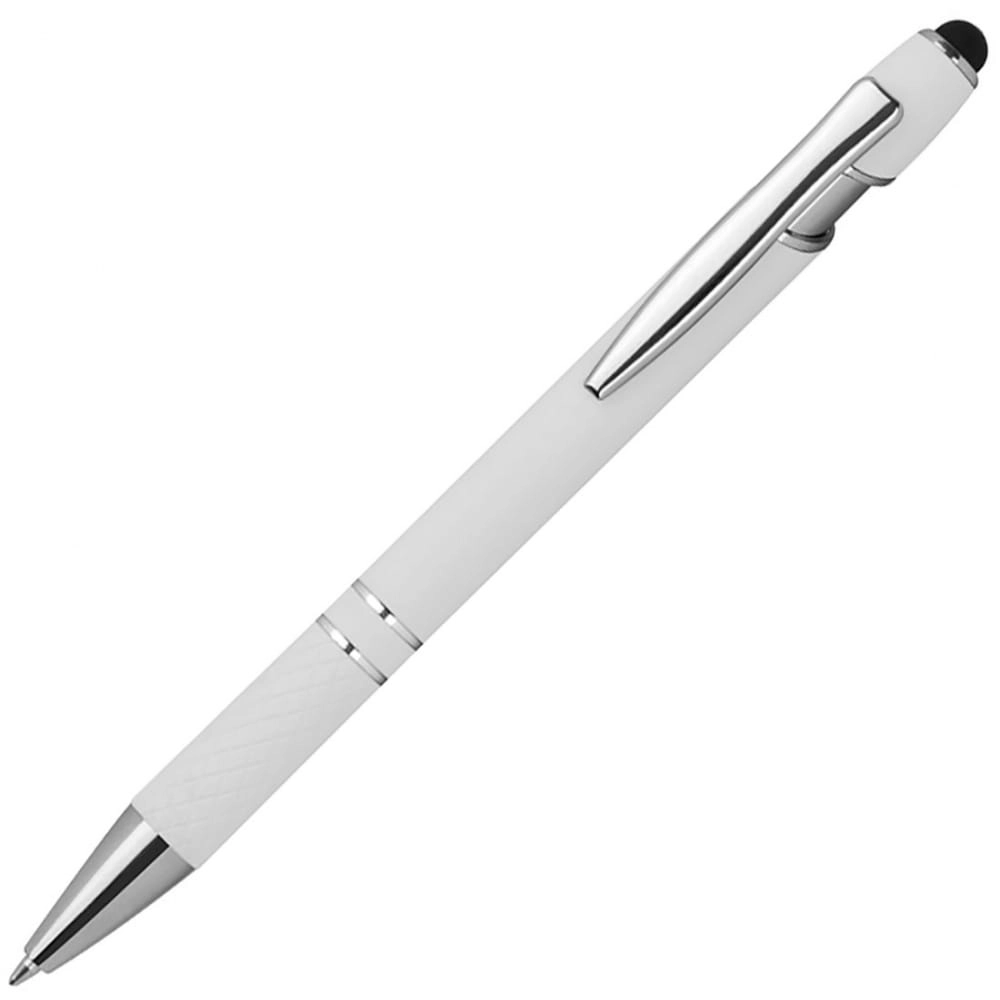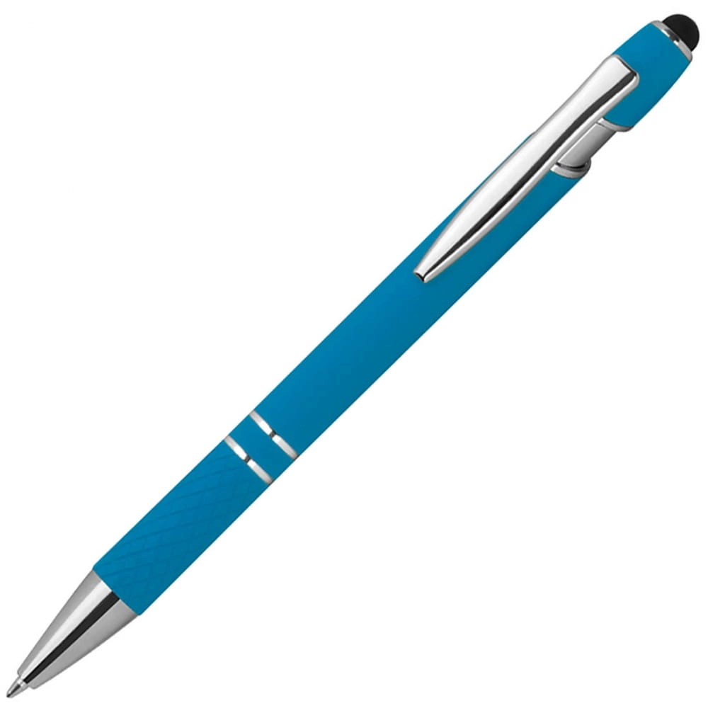 Aluminiowy długopis i srebrnymi elementami, niebieskim wkładem, końcówką touch pen do obsługi ekranów dotykowych i gumową strefą uchwytu.