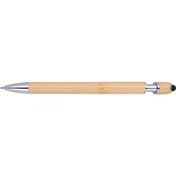 Długopis wykonany z bambusa, ze srebrnymi elementami, wkładem piszącym na niebiesko i końcówką touch pen.
