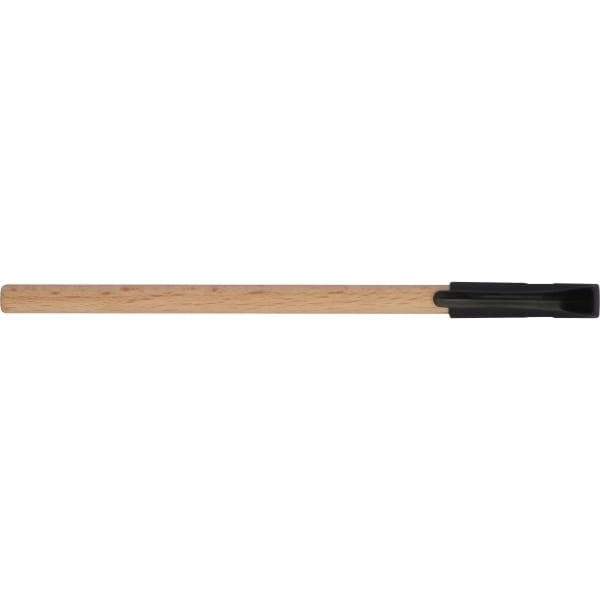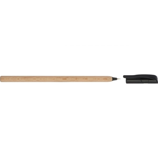 Jednorazowy długopis wyprodukowany z drewna, piszący na czarno. Długopis bez możliwości wymiany wkładu, wyposażony w czarną plastikową zatyczkę.