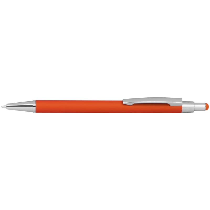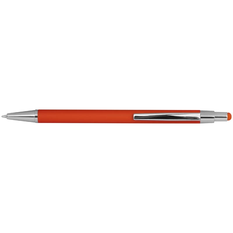 Smukły metalowy długopis z gumowaną powierzchnią. Posiada wkład piszący na niebiesko i końcówkę do obsługi ekranów dotykowych.