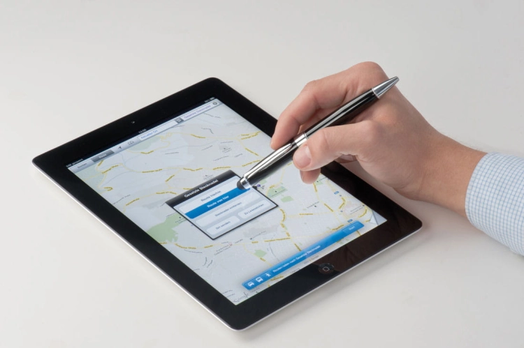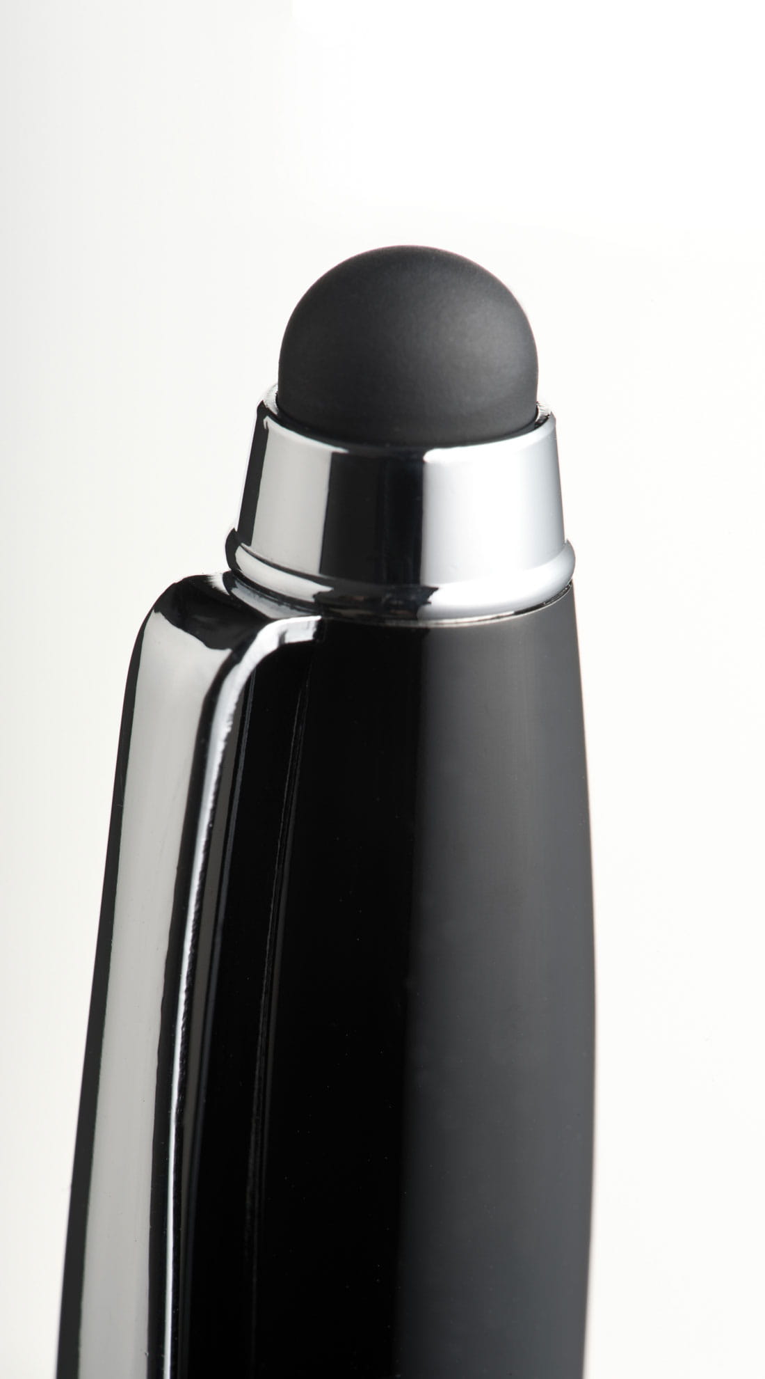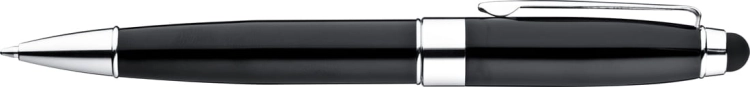 Długopis metalowy z mechanizmem obrotowym o klasycznym wzornictwie. Posiada duży, niebieski wkład oraz specjalną końcówkę do obsługi ekranów dotykowych.