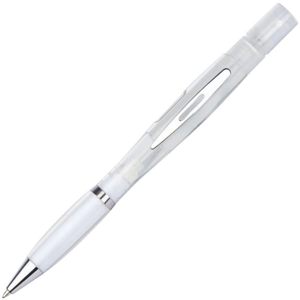 Półprzezroczysty długopis z mechanizmem obrotowym ze srebrnymi wykończeniami i niebieskim wkładem. Spryskiwacz jest wielokrotnego użytku - idealny do perfum lub płynów dezynfekujących.