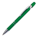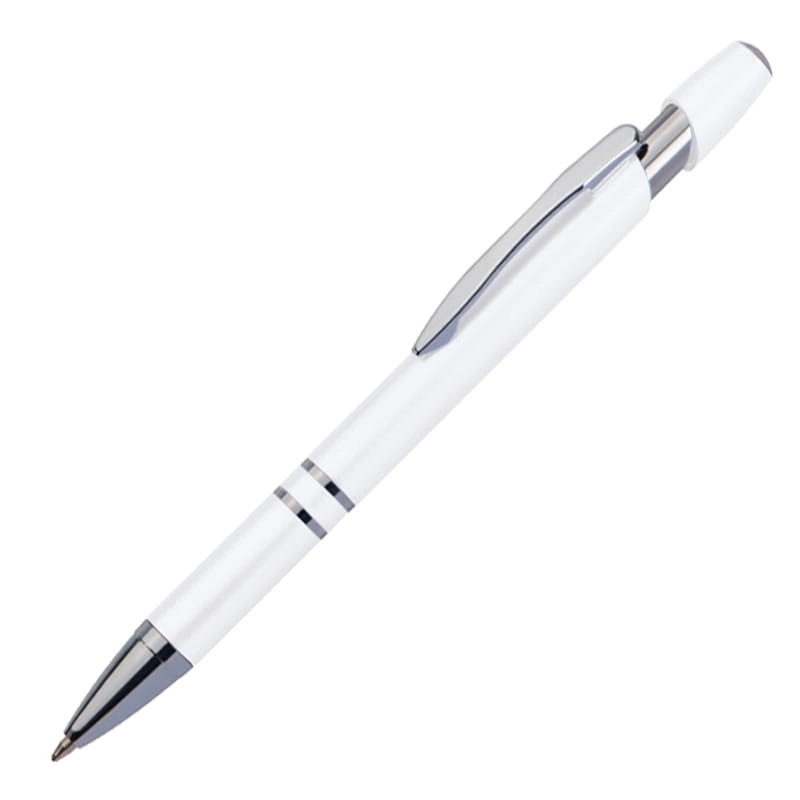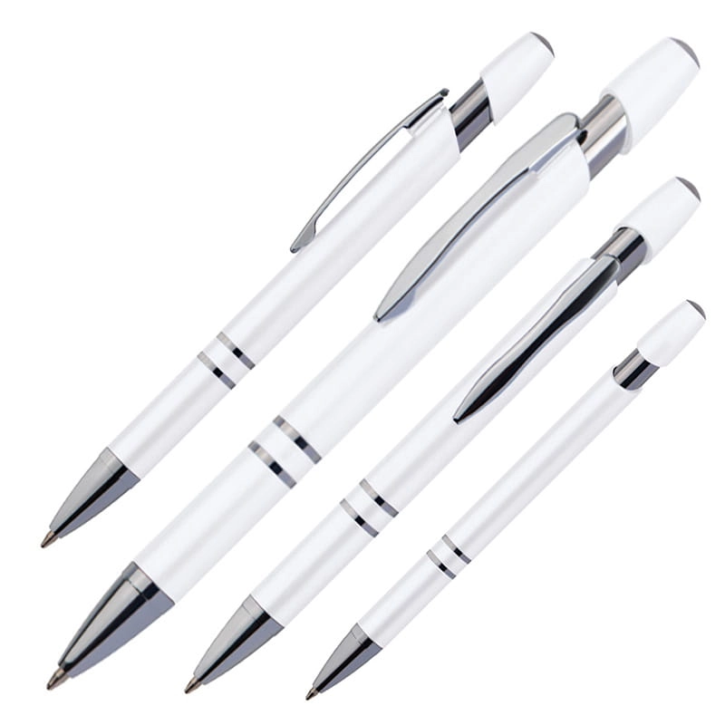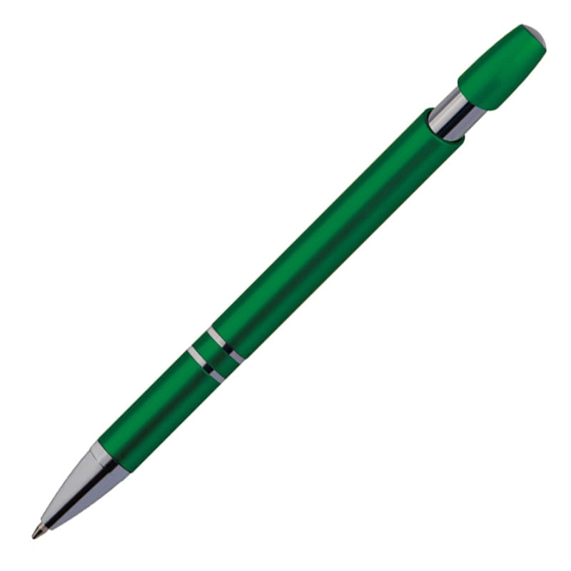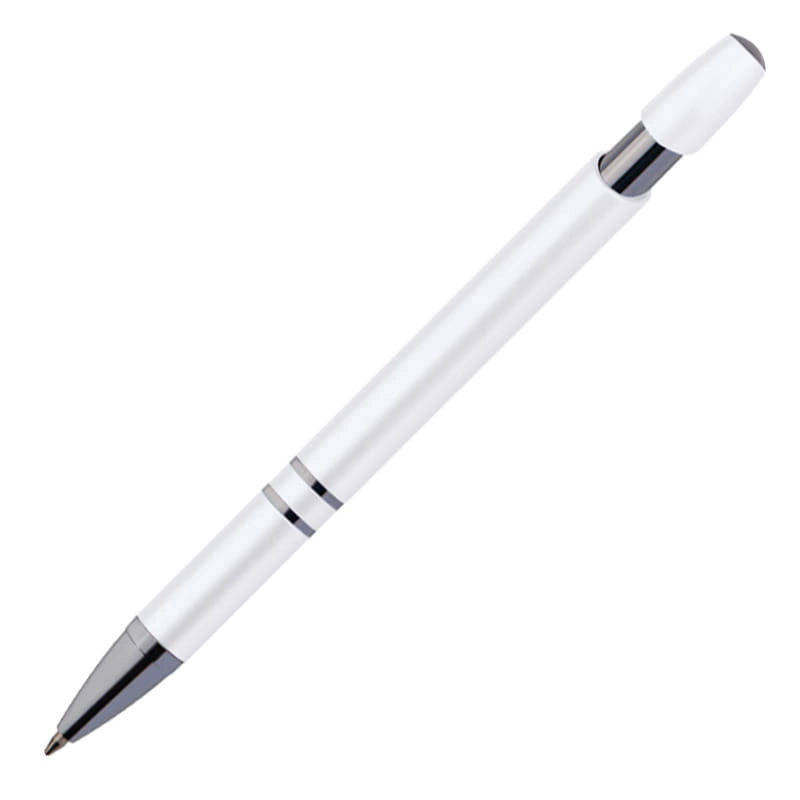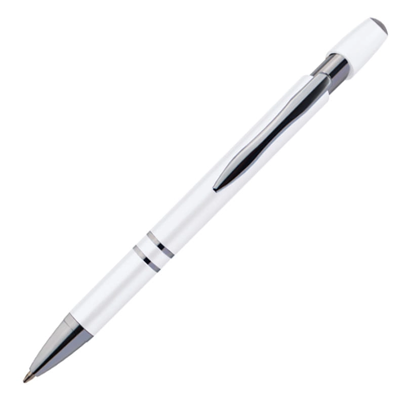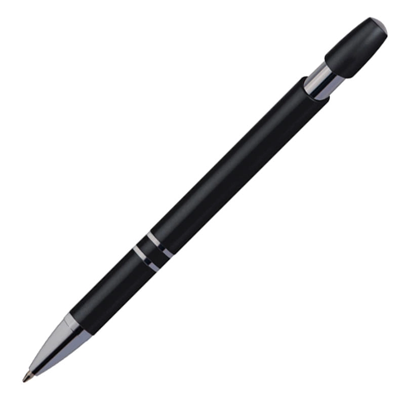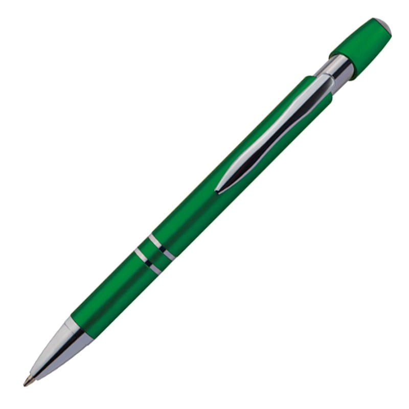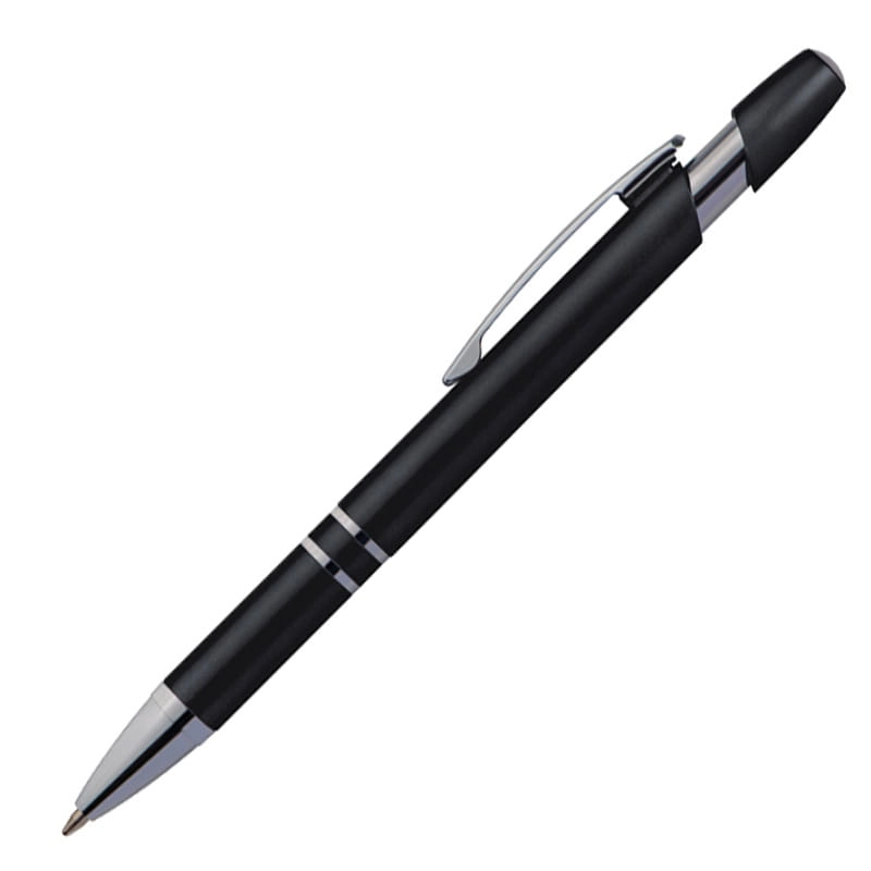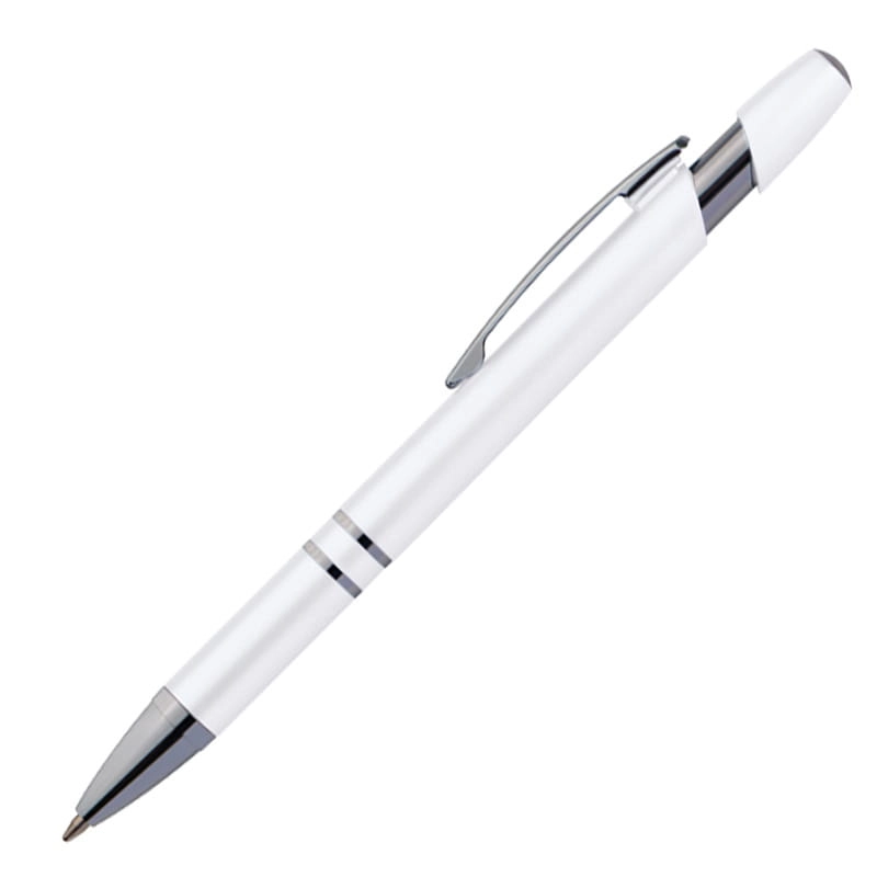 Długopis plastikowy z metalicznym wykończeniem i dużym wkładem piszącym na niebiesko. Logotyp można umieścić na korpusie obok klipsa.